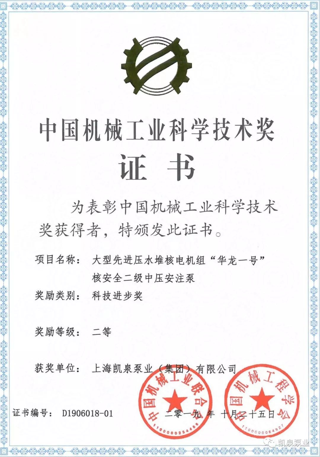 近日,凯泉与中广核工程有限公司联合研制的《大型先进压水堆核电机组“华龙一号”核安全二级中压安注泵》项目荣获中国机械工业科学技术奖——科技进步奖二等奖。大型先进压水堆核电机组“华龙一号”核安全二级中压安注泵国产化研制的成功,对发展民族工业能力,对增强我国核能装备的竞争能力都起到了一定的积极作用。另外,研制过程中一些关键技术的解决,如Q-H曲线陡降的设计方法,多工况点低比速高效和汽蚀性能优异的水力模型开发研究、泵总体结构、核级泵可靠性、先进制造工艺、涵盖加气、热冲击、杂质、高温高湿特殊环境综合试验能力及测试等关键技术,对行业的技术水平、制造能力、试验能力的提升都有一定的积极推动作用。泵结构及关键技术的运行涉及各类授权专利6项。